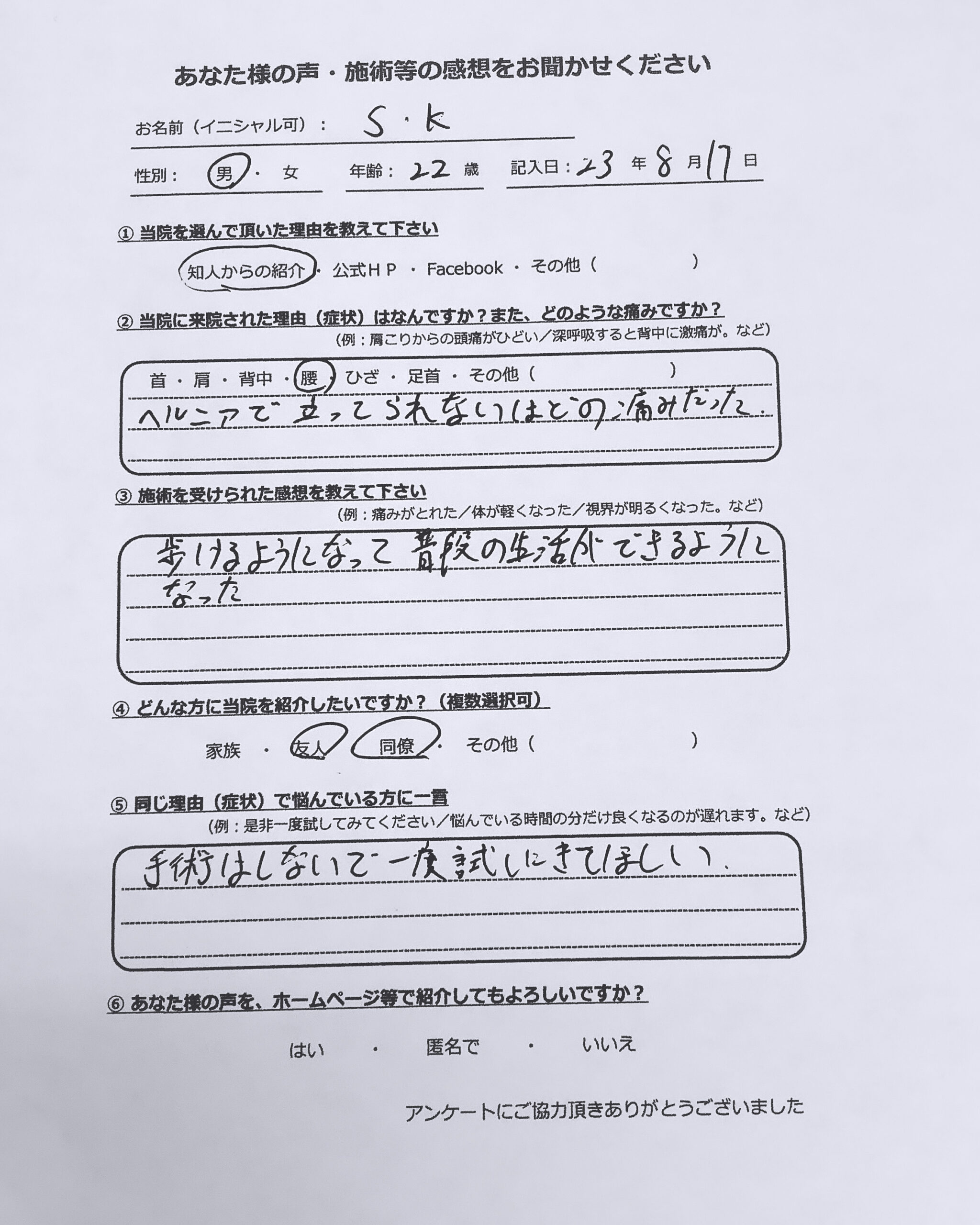 手術が必要と言われた椎間板ヘルニア。ヘルニアで立ってられないはどの痛みだった。歩けるようになって普段の生活ができるようになった。手術はしないで一度試しにきてほしい!